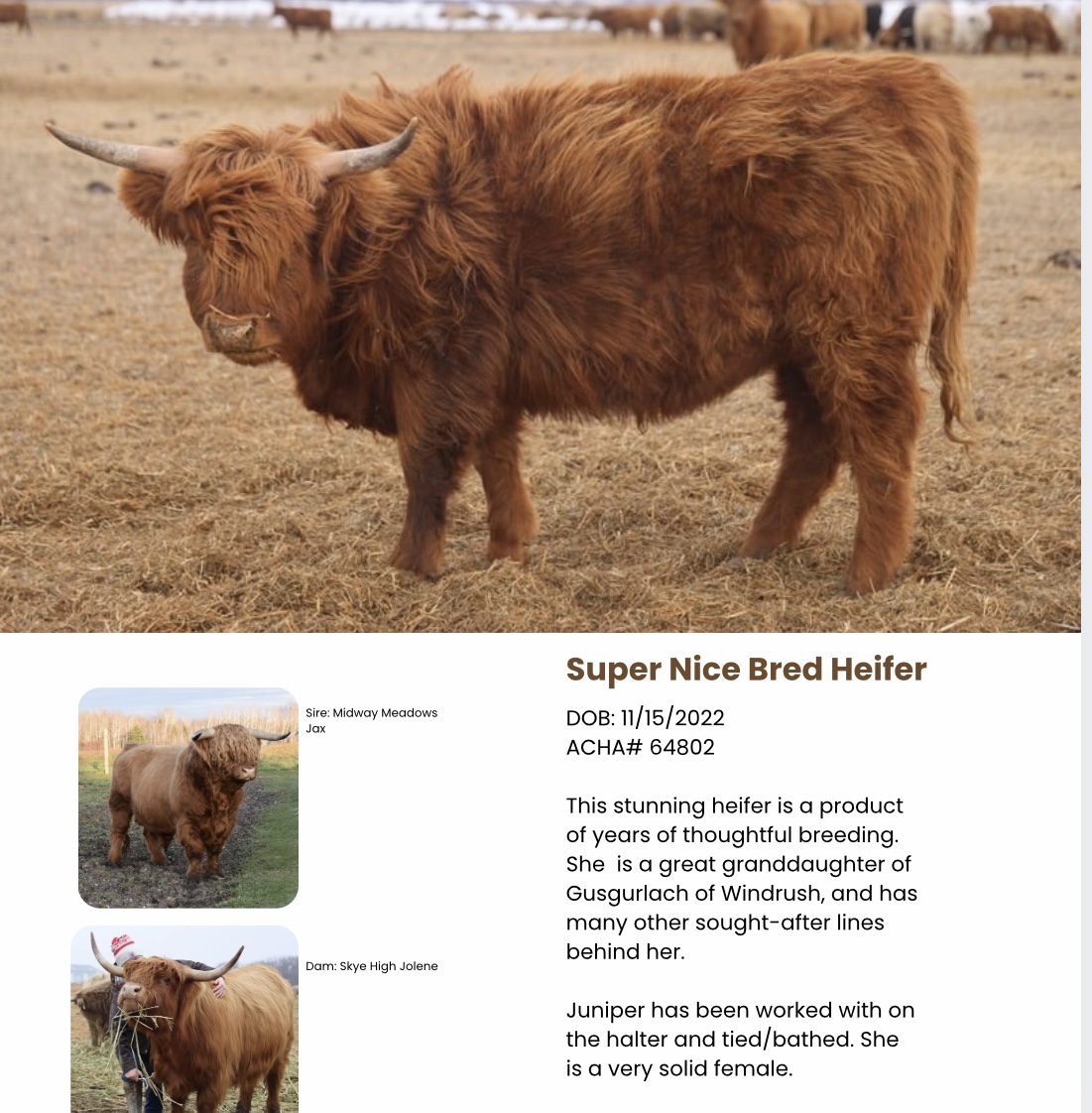 This is a strong genetic pairing with excellent pedigree, depth, and structure. Juniper is calm, easy to handle, and has been halter worked.
